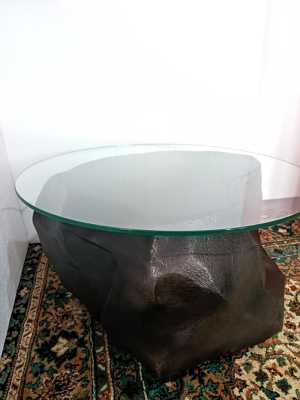 авторский декоративный журнальный столик со стеклянной столешницей , имитация камня из арт бетона , на колесиках.